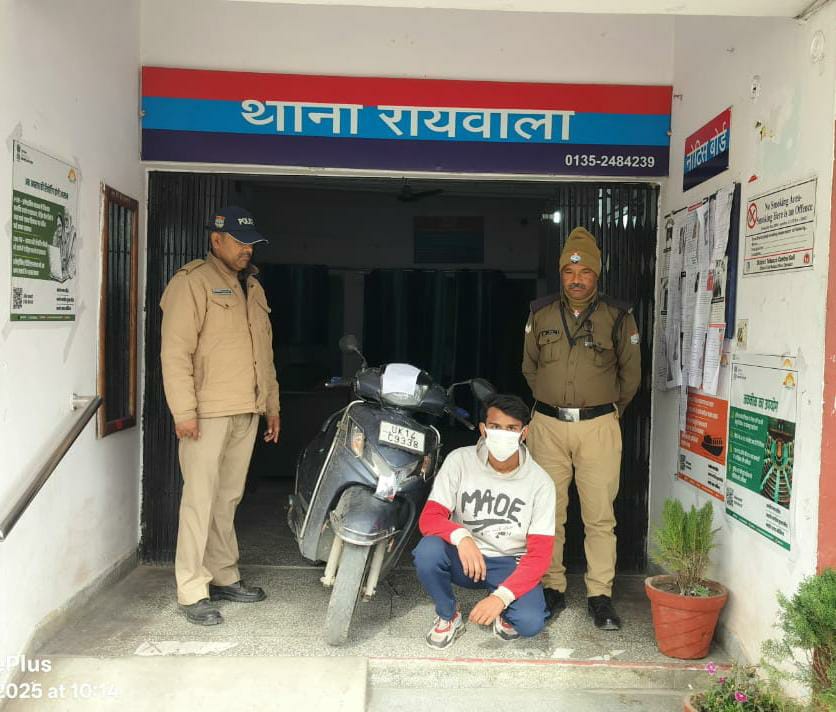 दिनांक 24-02-25 को वादी श्री जगदीश रयाल नि0 हरिपुर कला थाना रायवाला द्वारा एक लिखित तहरीर दी कि हरिपुर कलां से उनकी स्कूटी एक्टिवा सं0: यू0के0-14-सी- 9338 किसी अज्ञात चोर द्वारा चोरी कर ली है। तहरीर के आधार पर थाना रायवाला पर मु0अ0सं0-38/2025 धारा- 303(2) भा0न्या0सं0 पंजीकृत किया गया।